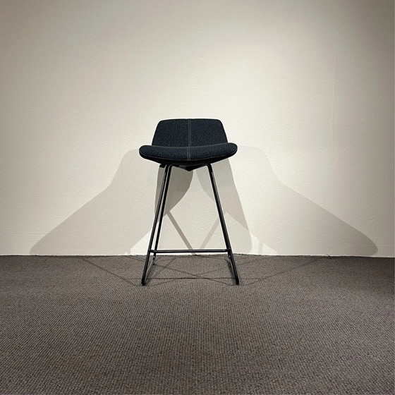 Taburete bajo de bar en tela Mica, color Hiedra. Costura artesanal con hilo Plata 412. Estructura en Seda Lava E2600.