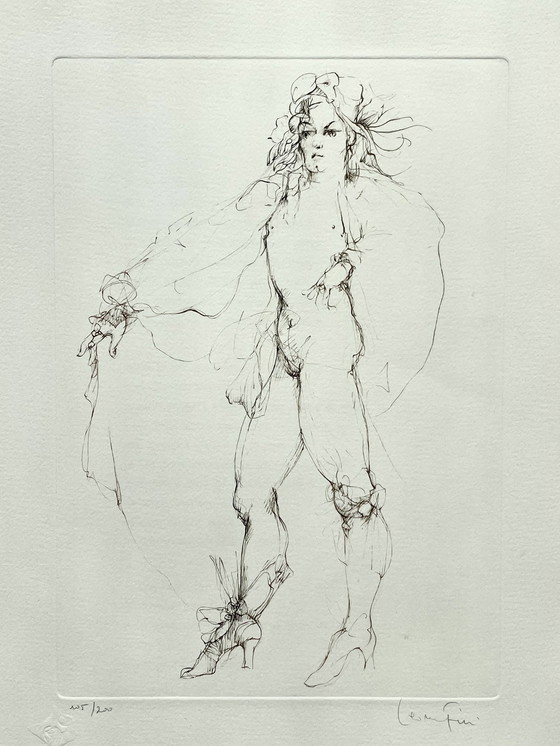 Grabado excepcional firmado a mano por la artista surrealista Leonor Fini, cada vez más apreciada con el movimiento de redescubrimiento del arte femenino. Esta rara litografía original es una prueba de artista en muy buen estado. Hermosa armonía de colores. Dimensiones: 38 x 28,5 cm. Leonor Fini fue el alma de la fiesta durante el movimiento surrealista, al igual que Leonora Carrington, Remedios Varo, Jacqueline Lamba y Claude Lalanne. Muchos la consideran la artista femenina más ferozmente independiente del siglo XX. A los 17 años, ya se había familiarizado con el arte renacentista y la pintura manierista. En 1931, con tan solo 24 años, Fini se mudó a París y conoció a artistas influyentes como Giorgio de Chirico y Carlo Carrà. También conoció e inició una relación romántica con el pionero surrealista Max Ernst, quien la presentó a otros artistas del movimiento. Su obra y su personalidad extravagante atrajeron la atención de muchos de los artistas y pensadores más célebres del siglo XX, como Salvador Dalí, Jean Cocteau, Albert Camus y Jean Genet, por nombrar solo algunos. Expuso su obra en numerosas galerías de arte parisinas, incluida la galería de Christian Dior, antes de que el icono de la moda se convirtiera en diseñador.