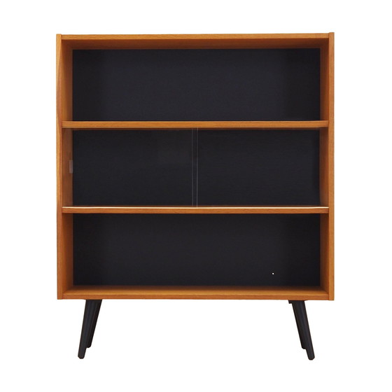 Esta librería se fabricó en la década de 1970, producida por la reconocida fábrica danesa Clausen & Søn. La estructura está revestida de chapa de fresno. Las patas son de madera maciza teñida de negro. Superficie renovada. Es ideal para una colección de libros o objetos de colección, ideal para espacios pequeños. El mueble tiene un orificio en el tablero trasero para el cable. Estado: La superficie del mueble ha sido renovada. Se aprecian pequeños arañazos, abolladuras y pérdidas de chapa. Las marcas de uso más importantes se muestran siempre en las fotos. El producto está listo para usar. *Por razones de seguridad, el mueble puede tener las patas desatornilladas para su transporte. El montaje no debería ser un problema. No obstante, en caso de duda, contáctenos y le enviaremos un video instructivo. Datos técnicos: altura: 123 cm, anchura: 104,5 cm, profundidad: 27 cm.