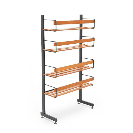 Librería italiana de la década de 1960. Estructura metálica pintada de negro con patas y detalles de latón. Estantes de listones de fresno. Buen estado general, con ligeras señales de uso, algunos estantes ligeramente curvados. Dimensiones: Largo 72 cm - Fondo 26 cm - Alto 132,5 cm REF M0822