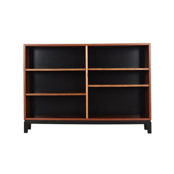 La estructura está revestida con chapa de nogal. Las patas son de madera maciza teñida en negro. La superficie se ha renovado. En el interior, se han incorporado cuatro prácticos estantes con alturas ajustables. La librería es la solución ideal para guardar libros en espacios reducidos. Además, servirá perfectamente como librería para objetos de colección.
