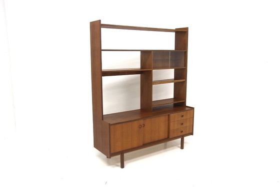 Librería de teca diseñada en Suecia en la década de 1960. En muy buen estado, estable y con mínimas señales de uso. Patas de haya. Unidad de dos piezas. Fiel a su estado original. 28635