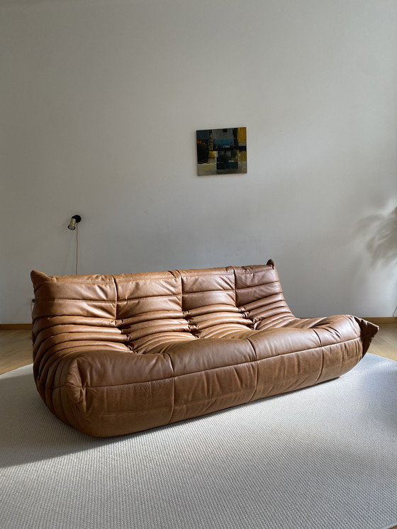 Vendo mi sofá Togo de 3 plazas de Ligne Roset, diseñado por Michel Ducaroy. El sofá está tapizado en un precioso cuero vintage de un cálido color coñac y se encuentra en muy buen estado. La piel tiene un bonito aspecto envejecido y es flexible, típico de la piel vintage de calidad.