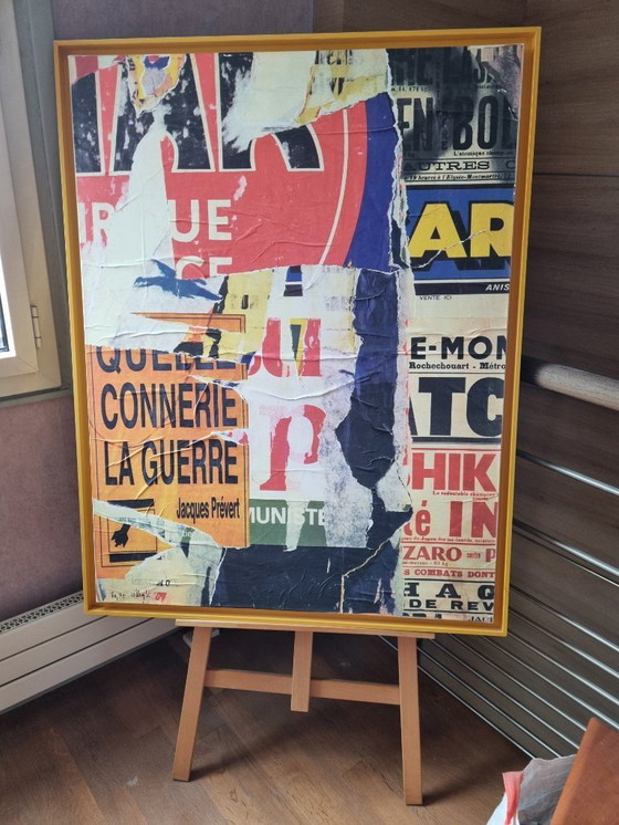 Litografía en relieve numerada y firmada por el artista Jacques Villeglé. El título es "quelle connerie la guerre" ("qué mierda es la guerra"), enmarcada en madera pintada de amarillo en un cajón americano, gran formato 100X140cm. Numerado 70/75, tengo todos los certificados de autenticidad y documentos en mi poder.