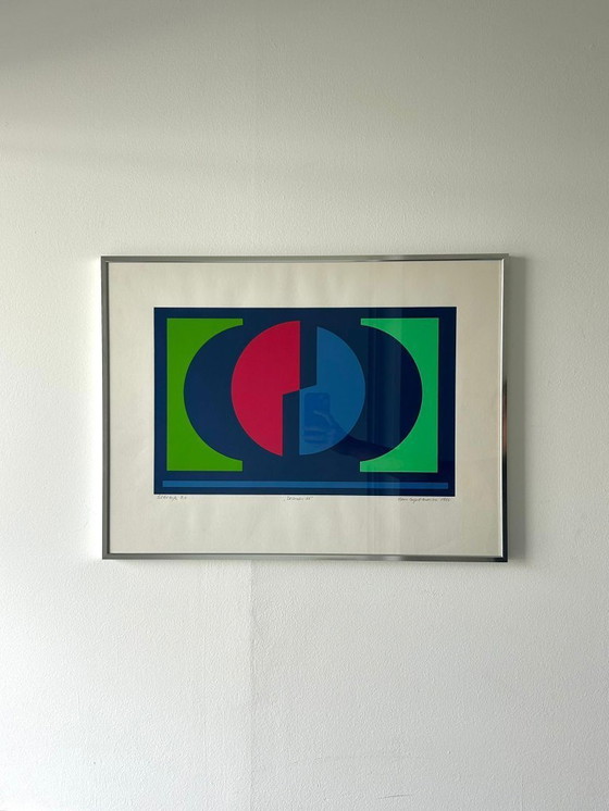 Preciosa litografía firmada realizada por Hans August Andersen en Dinamarca, 1988. Esta litografía de vibrantes colores azul, rojo y verde se realizó en una edición limitada de 307 ejemplares. Con marco de aluminio nuevo.