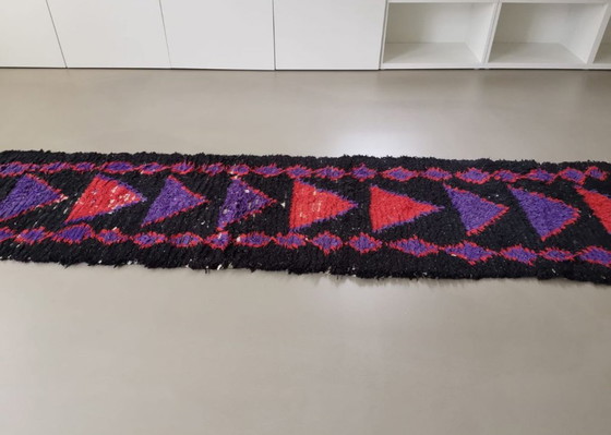 Esta alfombra Boucherouite, hecha a mano, mide 370 x 66 cm. Presenta un diseño vibrante y colorido con tonos predominantes en negro, rojo, morado y rosa. Está confeccionada con materiales textiles y luce un estilo bohemio que aporta un toque único y artístico a cualquier espacio. Perfecta para recibidores o como pieza destacada en la decoración de tu hogar.