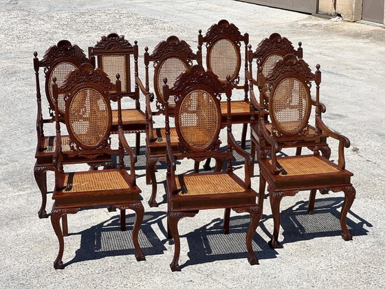 Juego de 6 sillones de estilo renacentista, finales del siglo XIX. Asientos y respaldos de mimbre, armazón de roble con carpintería tallada y torneada. Este conjunto, muy de moda, combina perfectamente con una mesa bicolor. Buen estado. Altura: 120 cm. Anchura: 58 cm. Profundidad: 56 cm. Altura del asiento: 47 cm. Altura de los brazos: 69 cm. Profundidad del asiento: 48 cm. Anchura del asiento: 51 cm.