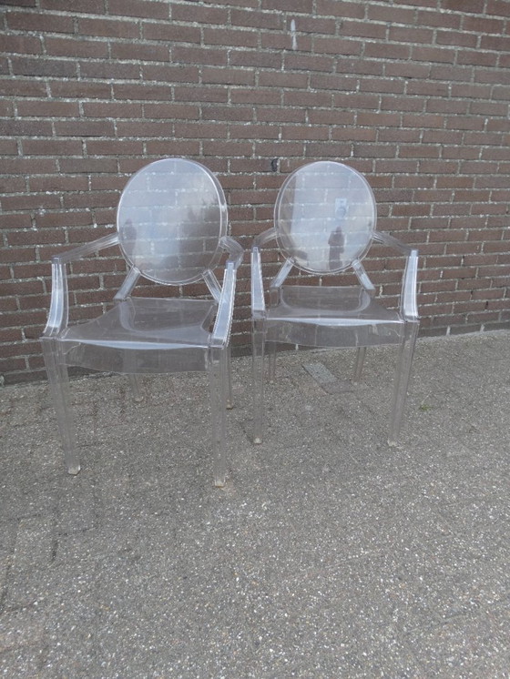 Juego de 2 sillas. ¡Otro hermoso diseño de Philippe Starck! Esta silla de diseño Kartell tiene un diseño transparente hecho de policarbonato, un tipo de plástico. ¡Un cómodo sillón apilable hasta en seis sillas! Su elegante diseño mide 54 cm de ancho x 55 cm de profundidad x 94 cm de alto. Silla única: hecha de plástico (policarbonato). Práctica: apilable hasta en 6 sillas. Altura ideal para sentarse a la mesa: 47 cm. Diseño: Philippe Starck.