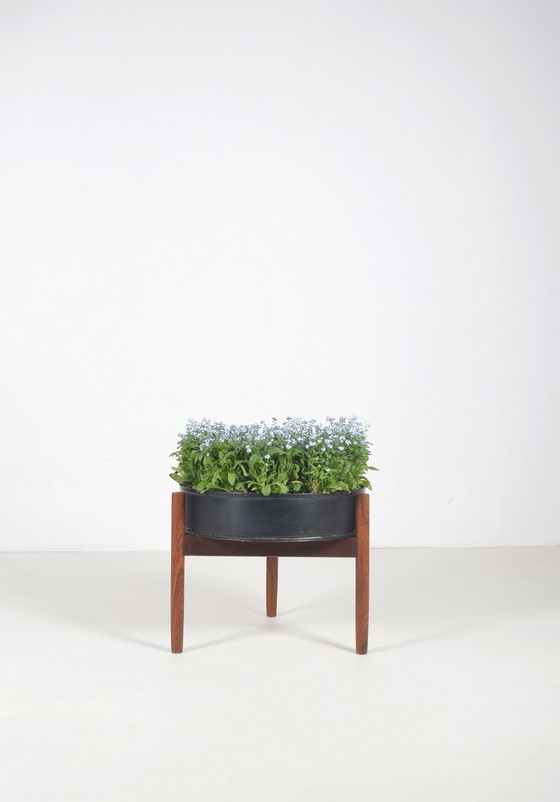 Macetero danés de la década de 1960, del fabricante de muebles Spøttrup. Se asemeja mucho a los taburetes que Hugo Frandsen diseñó para Spøttrup, por lo que es posible que sea del mismo diseñador. El macetero redondo de metal reposa sobre una base triangular de madera, creando una encantadora combinación geométrica.