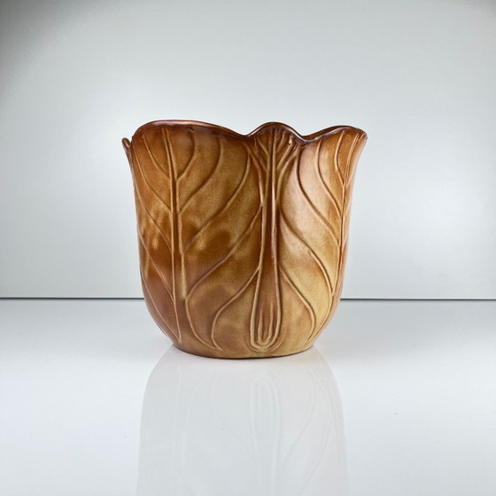 Macetero vintage de barro con un motivo en relieve de hojas estriadas, esmaltado en una hermosa paleta de marrones que van del caramelo al avellana. El motivo vegetal estilizado y la forma ligeramente ondulada del borde recuerdan las producciones escandinavas o de Vallauris de los años sesenta y setenta.