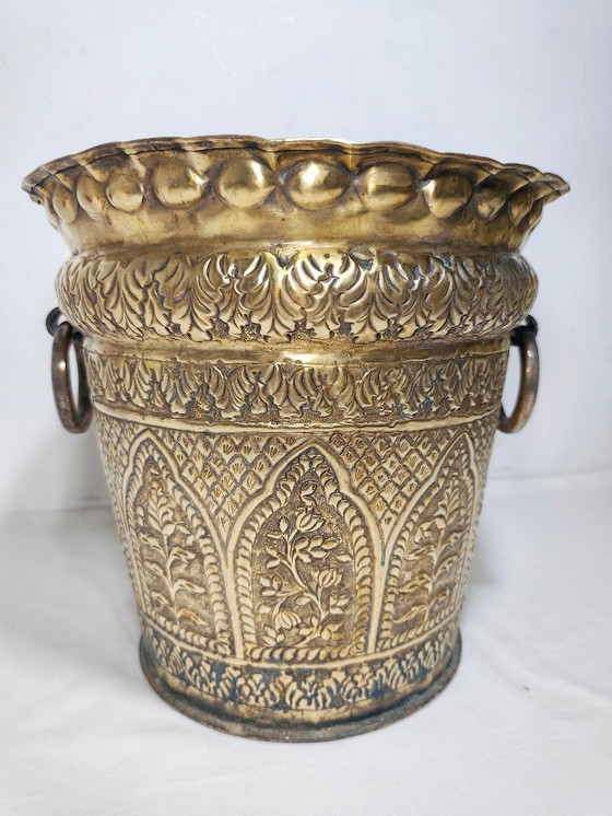 Esta exquisita maceta de bronce de los años 80, fabricada en España, presenta intrincados motivos florales y un encanto vintage. Su tono dorado y su detallado diseño la convierten en una pieza decorativa perfecta para cualquier hogar o jardín. La maceta es robusta y tiene un atractivo atemporal, ideal para exhibir sus plantas favoritas.
