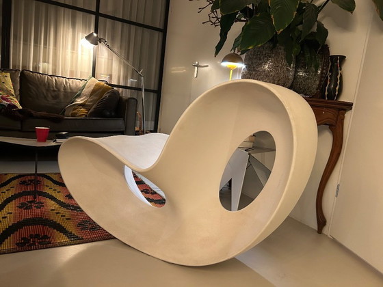 Esta llamativa pieza de mobiliario es la mecedora Voido, un diseño futurista del famoso diseñador Ron Arad para la marca italiana Magis. La silla está fabricada en polietileno moldeado por rotación, un plástico resistente que la hace robusta y sorprendentemente ligera. Gracias a su material resistente a la intemperie, es apta tanto para interiores como para exteriores.