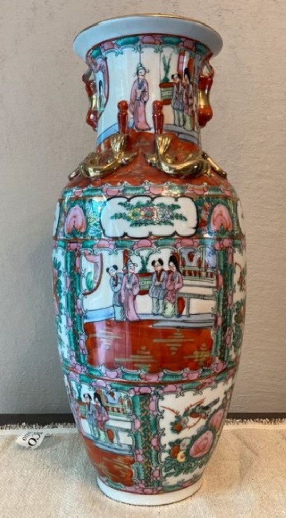 Magnífico jarrón Canton "Medallón Rosa" – Porcelana – 42 cm