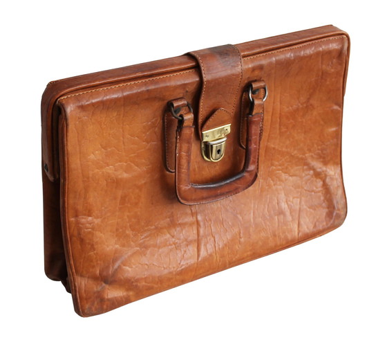 Este maletín original para hombre, fabricado en la década de 1950, se cree que se produjo en la antigua Checoslovaquia. Es de cuero marrón, con dos asas fijas y cerradura de acero. La cerradura está fijada a una correa de cuero que va desde la parte trasera, pasando por la superior, hasta la delantera. Su interior está revestido de tela gris claro y el espacio de almacenamiento se divide en tres secciones de tamaño similar, una de ellas con cremallera. Este maletín no solo es un complemento perfecto para la moda vintage, sino que también puede utilizarse en interiores como revistero o portalibros independiente. El bolso se encuentra en buen estado vintage, con ligeros signos de desgaste y pátina propios del uso.