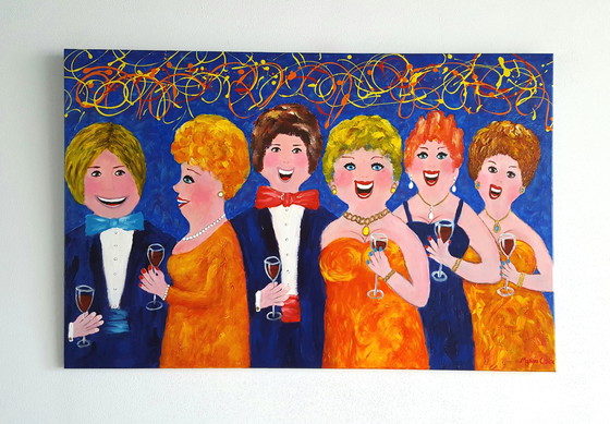 Celebre la vida con esta vibrante pintura de Manou Claire, titulada "Brindemos por los Campeones". Esta obra de arte irradia alegría y festividad, perfecta para iluminar cualquier espacio. Los coloridos personajes, con sus atuendos festivos y copas en mano, aportan un ambiente alegre a su hogar. Ideal para los amantes del arte figurativo que desean dejar huella en su interior. Pintura acrílica sobre lienzo, con acabado de barniz brillante. Colores: naranja, azul, rojo, blanco, amarillo, marrón y tono piel. Dimensiones: 75 x 115 cm. Incluye certificado de autenticidad y está firmada por el artista.