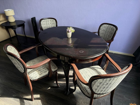 Perteneció a mi abuela. Ella siempre cuidaba bien sus cosas y tenía buen ojo y amor por los objetos antiguos con bonitos detalles (véanse los detalles en la tabla). Por desgracia, ya no está y no sé de dónde salió. No hace mucho que tapizó las sillas con tela de alta calidad.
