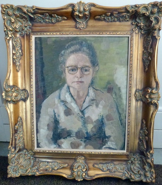 Marco grande con la imagen de una mujer mayor sobre lino.