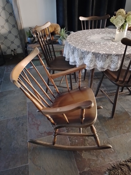 Esta mecedora vintage es un magnífico complemento para cualquier interior. Fabricada en madera resistente, ofrece una experiencia cómoda y relajante. El clásico diseño de barra añade un encanto atemporal a la silla. Perfecta para un rincón de lectura tranquilo o como pieza decorativa en el salón.
