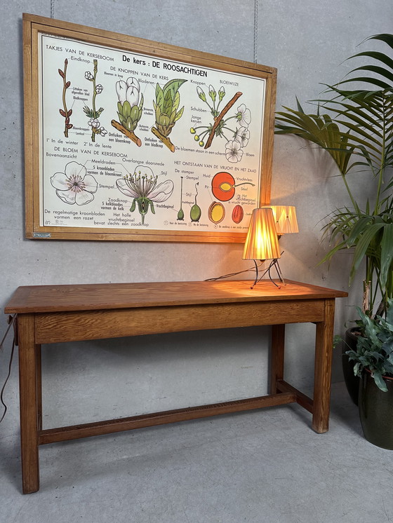 Antigua mesa baja/banco de pino albar. Cada una tiene un cajón en el lado corto. Proviene de una escuela. Posiblemente una mesa de jardín de infancia de la década de 1950. Podría servir como banco o soporte para plantas. El duramen del pino albar es más duradero que el pino actual. Fácilmente reconocible por su color y veta. Bien conservada, con leves señales de uso. Altura: 53,5 cm. Ancho: 109,5 cm. Fondo: 39 cm.