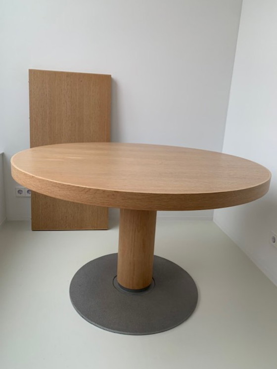Esta mesa redonda es de roble liso, tiene un diámetro de 120 cm a una altura de 74, el tablero incluido mide 120 x 60 cm, lo que permite que la mesa se convierta en 180 x 120 cm; la altura se puede ajustar 15 mm mediante un disco incluido. La mesa está en buen estado pero usada, testigo de algunos desconchones y decoloraciones. Debajo de la mesa se adjunta el certificado original de Arco.