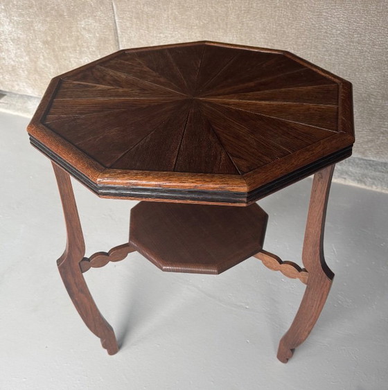 En muy buen estado: Mesa auxiliar de madera con incrustaciones, de estilo eduardiano, fabricada entre 1900 y 1909. Esta mesa auxiliar Art Déco presenta un tablero nonagonal con un motivo de estrella incrustado y patas cónicas. La parte inferior de las patas tiene una elegante forma curva. Debajo del tablero principal se sitúa un tablero nonagonal inferior. Este tipo de mueble se caracteriza por su refinada artesanía y su atención al detalle.
