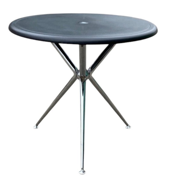 Mesa auxiliar Baleri Italia con estructura cromada y tablero de plástico negro.