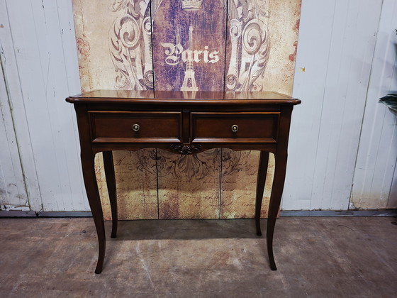 Esta clásica mesa auxiliar inglesa irradia elegancia y refinamiento, perfecta para el recibidor o la sala de estar. Con sus líneas elegantes y cálidos tonos de madera, añade un toque de encanto tradicional a cualquier estancia. La mesa cuenta con dos prácticos cajones, ideales para guardar objetos pequeños o papeles, combinando funcionalidad y estilo.