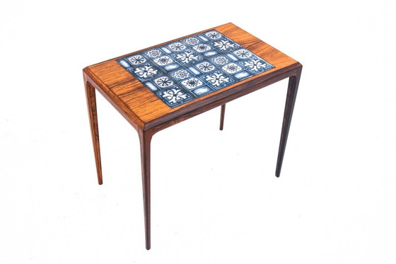 Fabricada a mediados del siglo XX en Dinamarca. Una pequeña mesa de centro, ideal incluso para habitaciones pequeñas. La forma sencilla y minimalista se ha roto con un elemento de cerámica en la parte superior.
