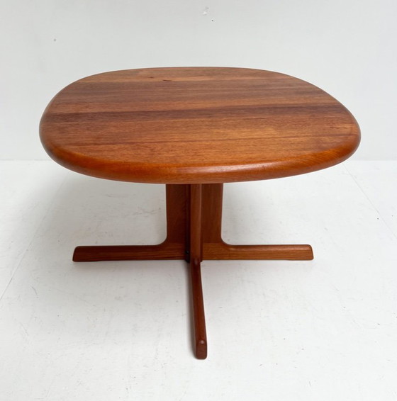 Cuadrada, pero con esquinas de formas orgánicas, mesa auxiliar o de centro de Dyrlund de la década de 1960. El tablero descansa sobre patas de forma inusual. Diseño reconocible de Dyrlund. Las dimensiones son 75 x 75 cm con una altura de 51 cm. La robusta estructura de madera está en buen estado, con ligeros signos de uso.