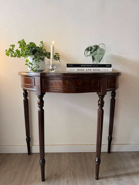 ¡Un clásico precioso! Una consola semicircular (modelo de media luna) con finas patas torneadas y un elegante tablero con incrustaciones y borde dorado. V