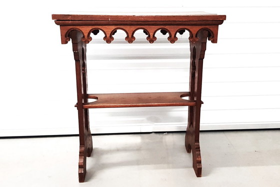 Mesa auxiliar de roble con pináculos y apoyada sobre patas curvas, neogótica, c. 1920,
