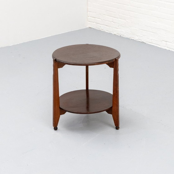 Mesa auxiliar de la Escuela de Ámsterdam, de los años 20-30, fabricada en roble macizo. Su diseño se caracteriza por los tableros redondeados de la tapa y la base, tres patas cónicas con sutiles tallas y pequeños pies esféricos. La madera presenta una hermosa pátina envejecida con ligero desgaste propio de su antigüedad, y la mesa es estable y muy funcional. Una pieza auténtica y con carácter de este expresivo periodo del diseño.