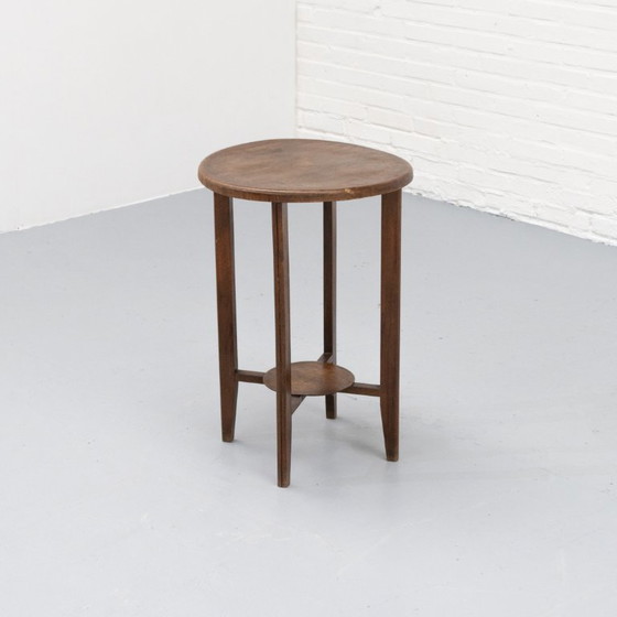 Mesa auxiliar francesa de los años 20, elaborada en roble, reconocible por su cálido tono marrón y su veta característica. La tapa redonda es ligera y de fina factura, con una estructura hueca, casi como una tapa, típica de la producción de muebles franceses de la época.