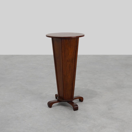 Su diseño presenta una base de columna facetada que se estrecha hacia arriba, culminando en una tapa perfectamente redonda, apoyada sobre un pedestal de cuatro patas con pies ligeramente curvados. Sus proporciones equilibradas y sus sutiles detalles resaltan la pureza geométrica y la artesanía características del diseño francés de la década de 1930.