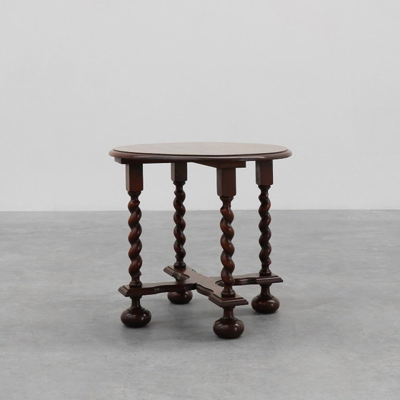 Mesa auxiliar redonda francesa de roble del siglo XX, de estilo Art Déco. Esta mesa presenta un hermoso tallado en Barley Twist, con patas unidas por un bastidor en cruz decorativo tallado, lo que le confiere unas líneas curvas y elegantes. La madera tiene un tono oscuro y rico que atestigua su antigüedad y calidad.