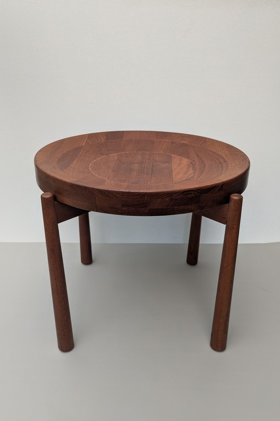 Mesa auxiliar (frutero) de teca maciza, diseñada por Jens H. Quistgaard en los años 50. Un lado del tablero tiene forma de cuenco, por lo que puede utilizarse como frutero. El otro lado es plano, por lo que puede utilizarse como mesa normal.