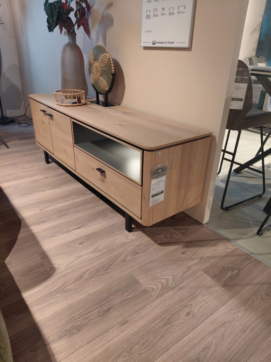 El mueble bajo de la colección de salón "Livada" de Henders & Hazel mide 170 cm de largo. Está acabado en chapa de roble silvestre natural y lacado. Las patas metálicas son negras.