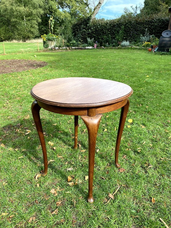 Preciosa mesa de centro/mesita auxiliar antigua de Francia (hacia 1960) de estilo clásico Luis XV. El tablero de madera tiene un diámetro de 70 cm y la mesa mide 75 cm de alto. Bellamente acabada con elegantes patas curvas, dando a esta mesa un aspecto atemporal y elegante.