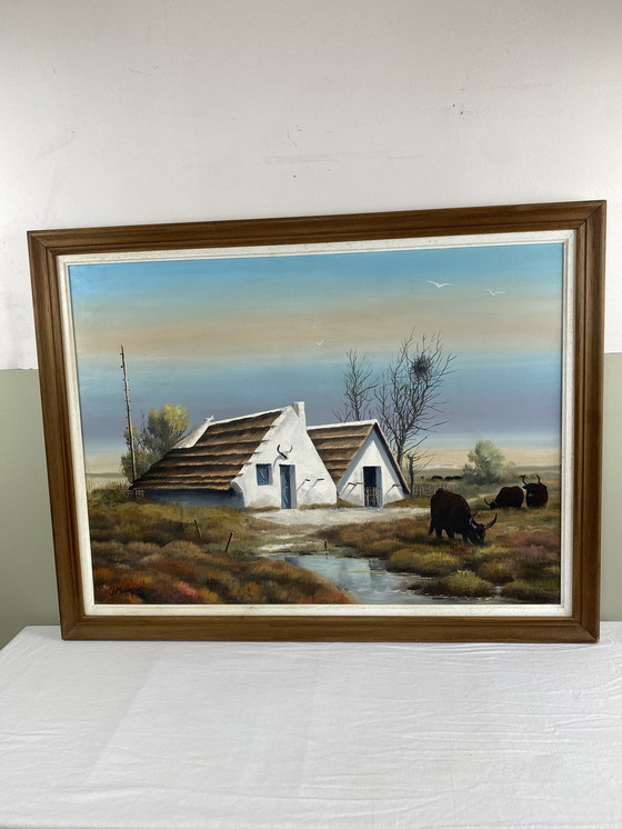Lienzo de gran formato del pintor camargueño Jean Marignan, certificado el 12 de julio de 1988.