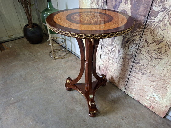Descubra la elegancia atemporal de esta mesa de centro redonda y clásica, elaborada con refinada chapa de nogal y adornada con una hermosa marquetería. Su elegante base y herrajes de latón le otorgan una apariencia majestuosa, ideal para un interior que irradia lujo y refinamiento. Haga que su espacio brille con esta mesa única, funcional y decorativa.
