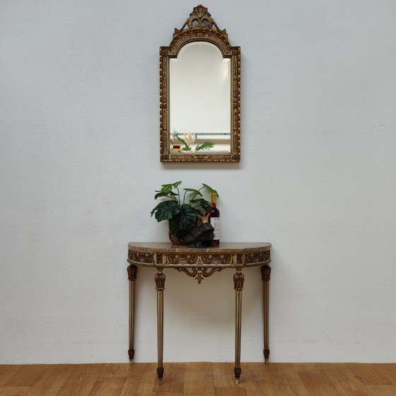 Este juego de consola de pared italiano es impresionante. Consta de un espejo biselado con cresta y una consola de pared o mesa consola con tablero de mármol. Completa un interior de estilo Hollywood Regency. Ideal para la sala de estar, el dormitorio o el recibidor.