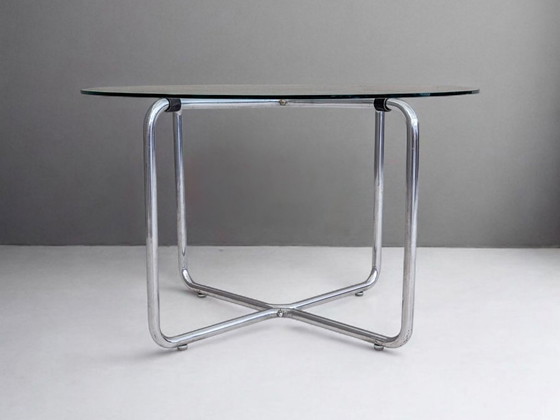 Una rara versión baja de la icónica mesa B 27 de Marcel Breuer, esta pieza reinterpreta el racionalismo de la Bauhaus mediante proporciones suavizadas y una sutil elevación. Con tan solo 50 cm de altura, transforma la mesa auxiliar habitual en algo más escultural: sencillo pero ligero. La estructura de acero tubular cromado se curva con su característica precisión, sosteniendo un tablero de cristal transparente que parece flotar. Debajo, unas almohadillas de goma (probablemente reemplazadas con el tiempo) suspenden la superficie en una tensión silenciosa: un sello distintivo de Breuer que combina utilidad y elegancia. Diseñada en 1927 y fabricada por Thonet o Mücke & Melder en la década de 1930 (falta la etiqueta), la B 27 ejemplifica la maestría de Breuer con el voladizo, traducida aquí a una forma horizontal. Esta versión, inusualmente baja y de un equilibrio exquisito, se encuentra en buen estado original, conservando las líneas limpias y el espíritu Bauhaus que siguen inspirando el diseño moderno. Dimensiones: Alto 50 cm, ancho de la estructura 69 cm, diámetro del cristal 80 cm.
