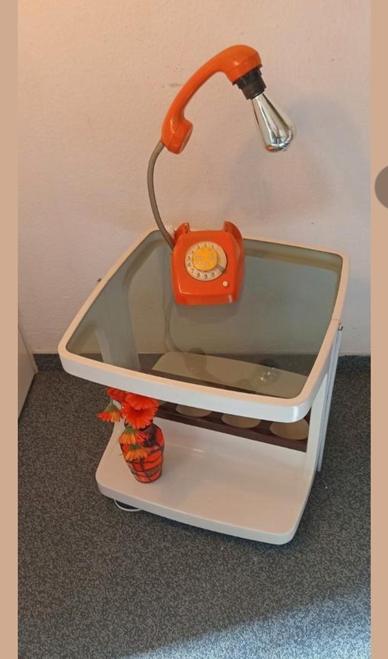 Esta es una mesa de bar única, de estilo espacial, de la década de 1970. Tiene un aspecto retro y una superficie de cristal ahumado. Está hecha de plástico resistente y vidrio, y cuenta con un práctico espacio para guardar botellas u otros artículos. Perfecta para los amantes del diseño vintage y retro. Presenta leves signos de uso, pero le falta una pequeña pieza del inserto marrón en un lateral. Ver fotos.
