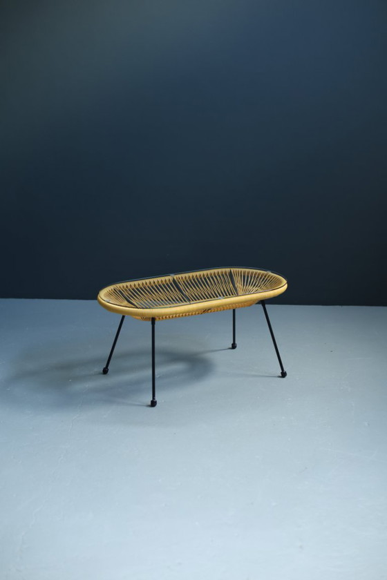 Una llamativa forma ovalada, definida por una base única de tiras de plástico. El tablero está fabricado en vidrio transparente, ofreciendo una superficie que complementa la forma escultural del tejido. Las patas de acero negro sostienen el diseño.