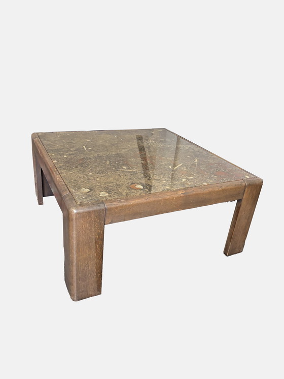 Mesa de centro antigua con cubierta de piedra fósil y patas de madera