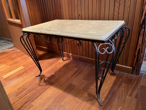 Mesa de centro antigua de hierro forjado y mármol.