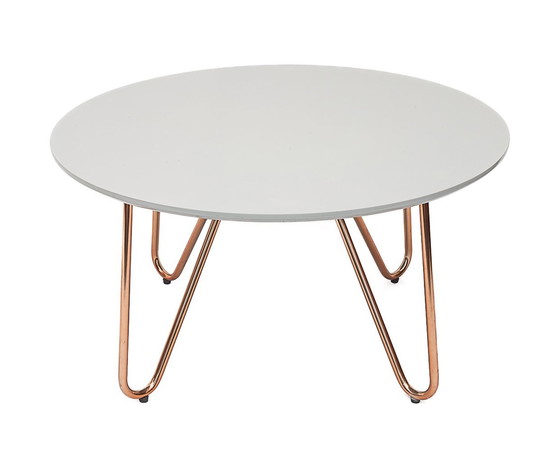 Mesa de centro o auxiliar redonda. Tablero de madera gris. Cuatro patas tubulares de cobre. Década del 2000.
