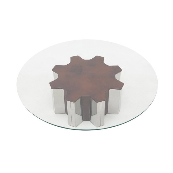 Mesa de centro de fabricación italiana de los años 70. Tablero circular de cristal transparente. Base de acero y polipiel marrón. Excelente estado general, con algunas pequeñas marcas en la polipiel. Dimensiones: Diámetro 110 cm - Altura 30 cm. REF T0586