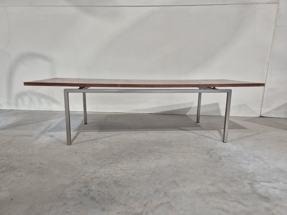 Mesa de centro vintage de mediados de siglo con tablero flotante. Tiene algunas manchas y arañazos en el tablero, pero en general está en muy buen estado.