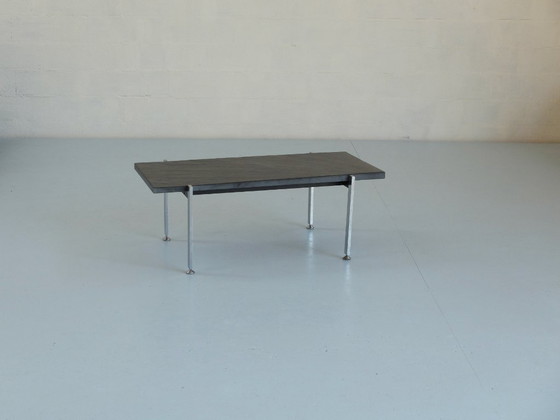 Mesa de centro de piedra de pizarra sobre patas de barra de acero cromado, obra francesa de los años 50, muy bien hecha, buen grosor de la pizarra, producto seleccionado por el equipo STAND, sala de exposición en Uzès, Gard, Francia, entrega agrupada disponible a petición.